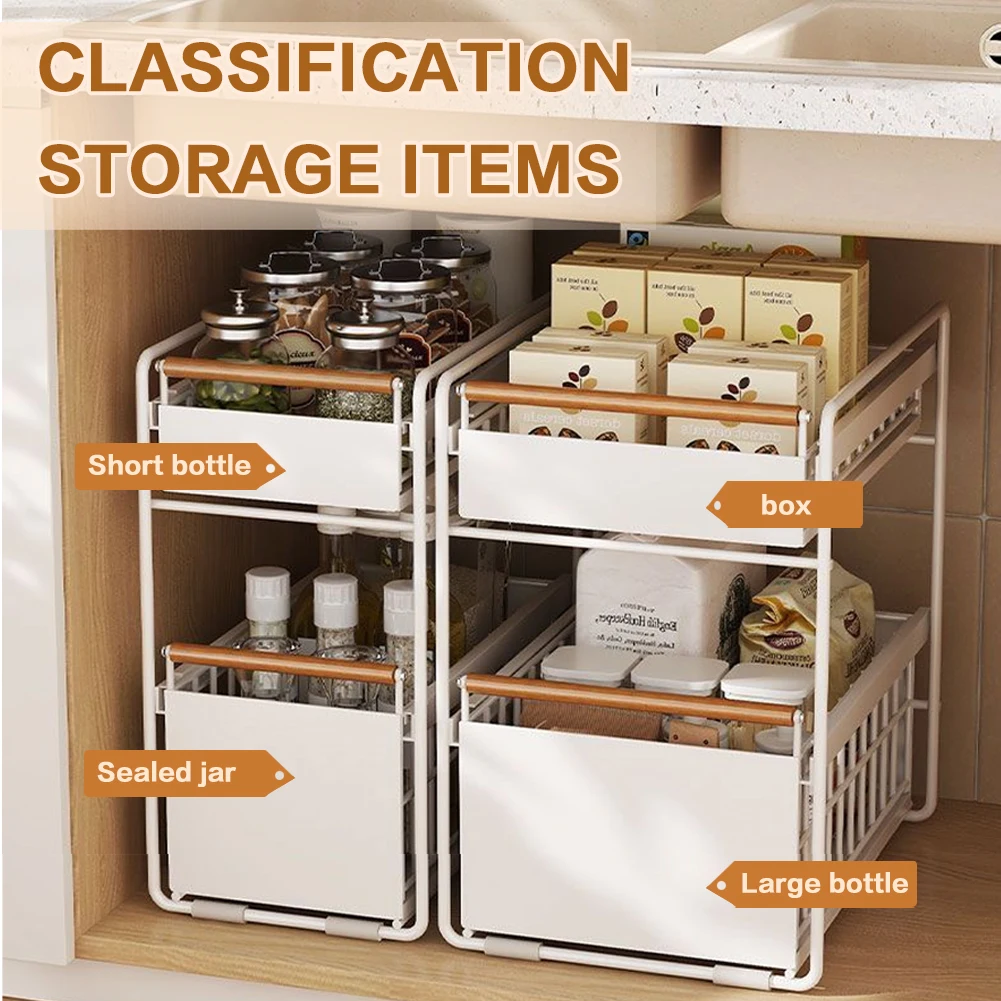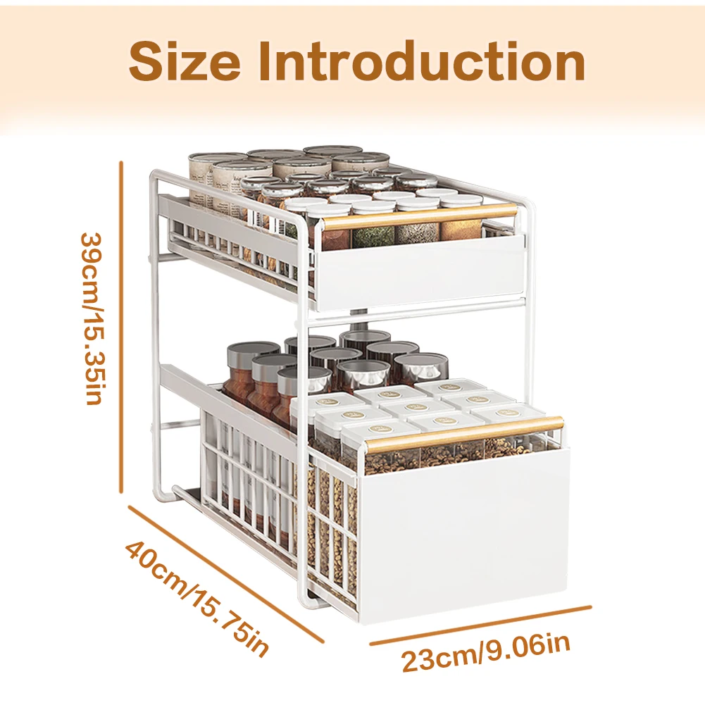 Keep your cabinets neat and organized with this 2-Tier Pull-Out Cabinet Organizer. Designed with smooth sliding drawers, this space-saving organizer allows you to easily access items stored deep inside cabinets or under the sink.